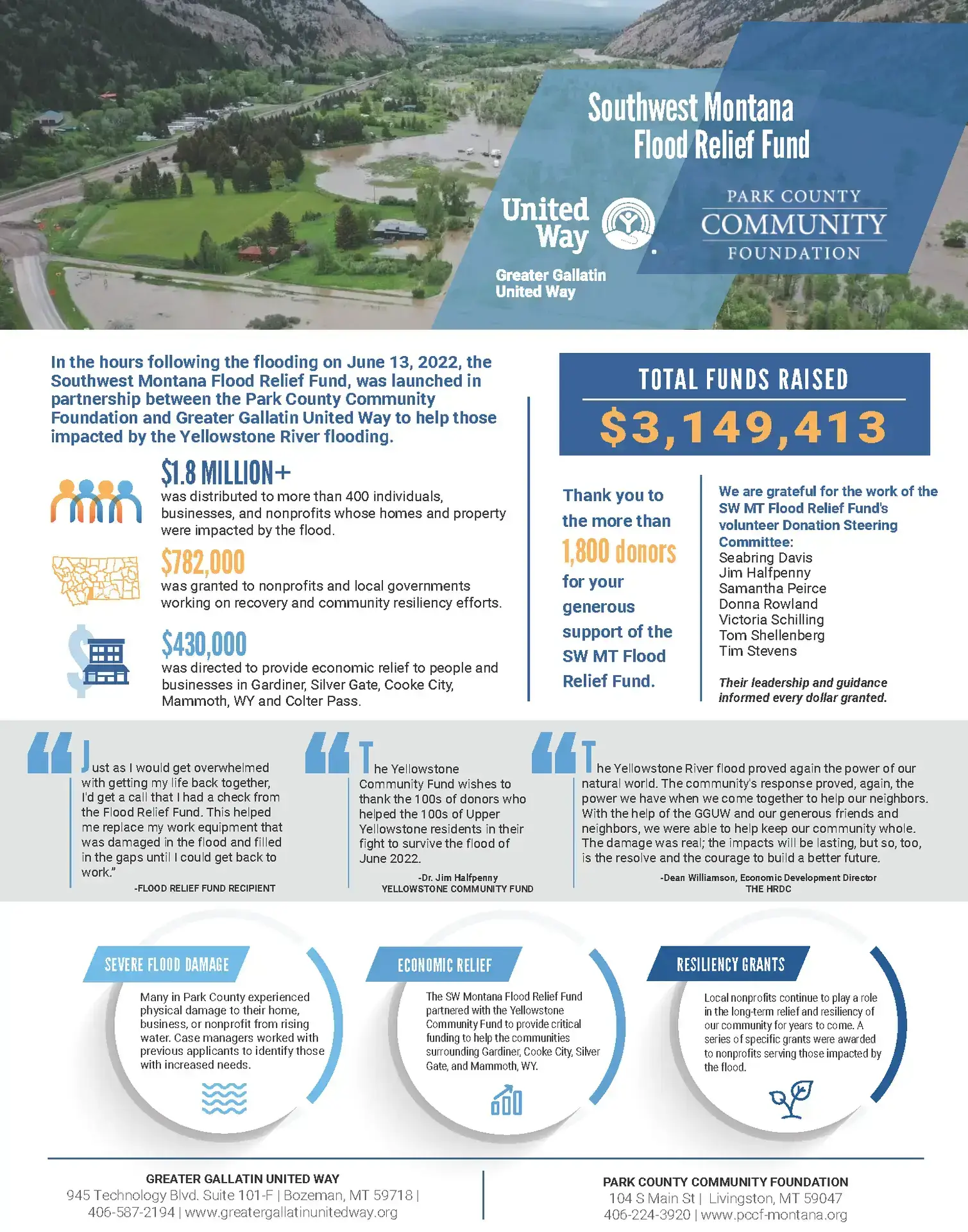 In the hours following the flooding, the Southwest Montana Flood Relief Fund- serving Park County, was launched in partnership between the Park County Community Foundation and Greater Gallatin United Way to help people, businesses, and nonprofits in Park County impacted by the flooding.