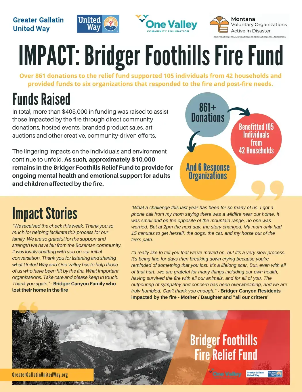 In the past few years our community has endured through the Yellowstone River Flood, Bridger Foothills Fire and the COVID-19 Pandemic, and alongside with our partners, and our community, we responded – by fundraising, assessing community needs, and distributing funds in a transparent, secure manner.